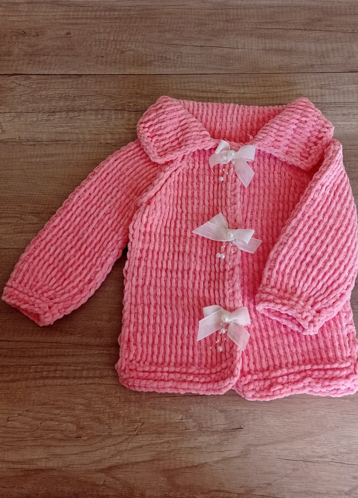 Kız çocuklar için pembe, örgü kadife kumaştan yapılmış, uzun kollu ve dar kesim hırka. Önünde üç fiyonk çıtçıtlı düğme bulunur, normcore tarzda.