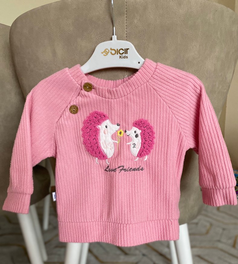 Pembe tonlarında, uzun kollu, yuvarlak yaka, kadife, kirpi desenli ve omuzda düğme detaylı kız çocuk takımı. Rahat kesimiyle günlük kullanıma uygundur.