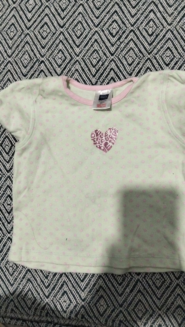 Kız çocuk tişörtü, kısa kollu ve yuvarlak yakalıdır. Pamuklu, rahat kesim ve pastel beyaz renkte, pembe puantiyeler ve kalp baskısı vardır. Düğmeli ve sokak stili için uygundur.