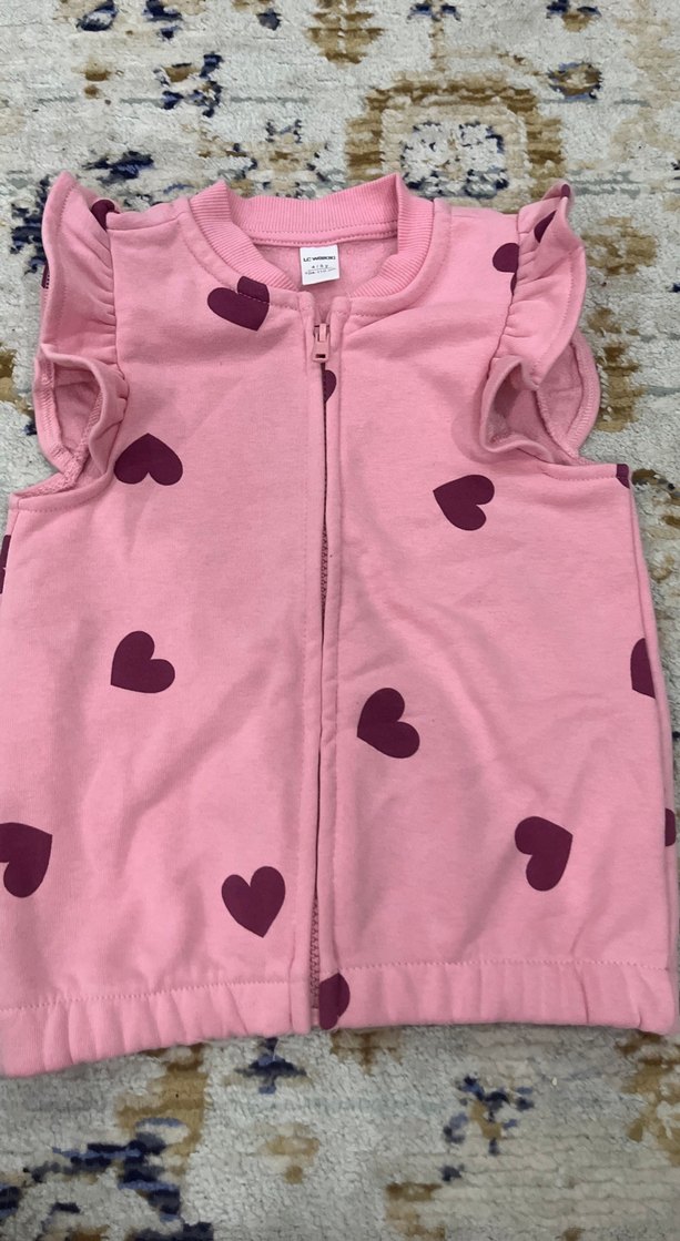 Yumuşak kumaştan yapılmış, kalp desenli, V yaka, fermuarlı ve kolsuz pembe kız çocuk yeleği.