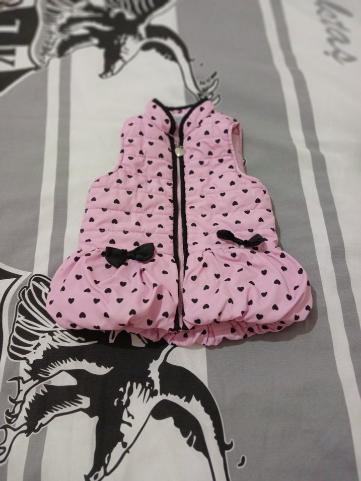 Kız çocukları için kapüşonlu, kalp desenli pembe, kolsuz ve dar kesim yelek. Fırfırlı ve küçük fiyonk detayları ile renkli sokak stili.