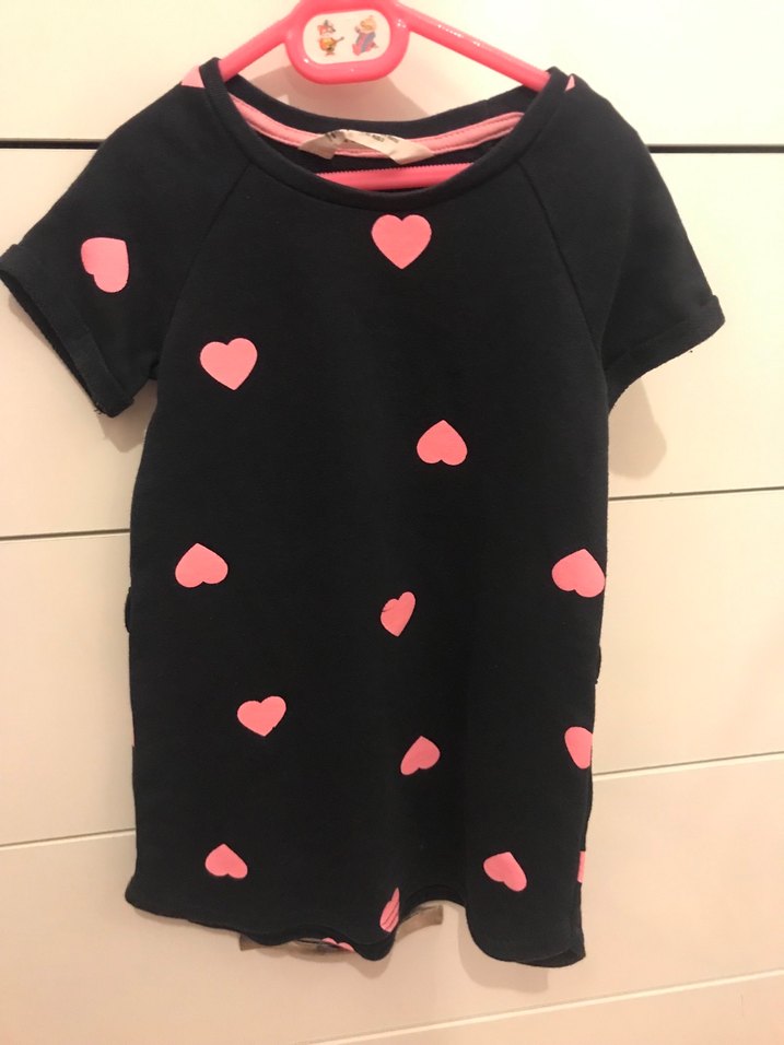 Kısa kollu, yuvarlak yakalı, bol kesim kız çocuk elbisesi. Pembe kalp desenleriyle süslenmiş, yumuşak ve sıcak kumaştan yapılmıştır.