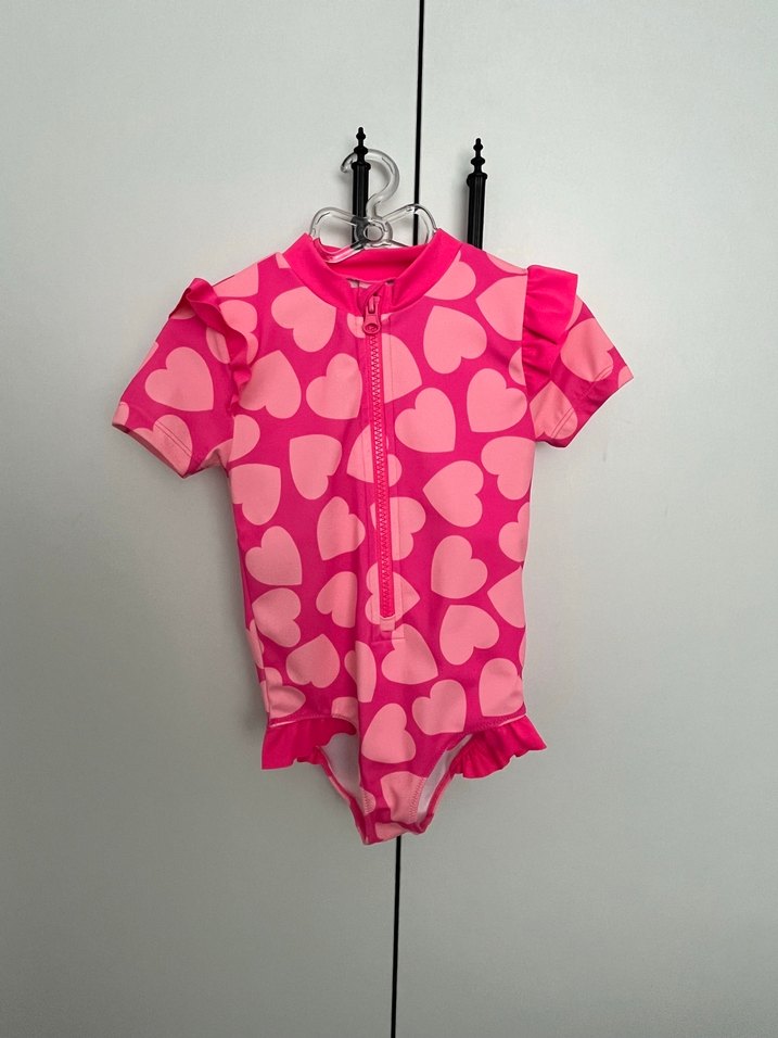 Kız çocuk kısa kollu mayo, ön fermuarlı ve pembe kalp desenlidir. Kol ve basenlerde fırfır detayları bulunur. Outdoor kullanıma uygundur.