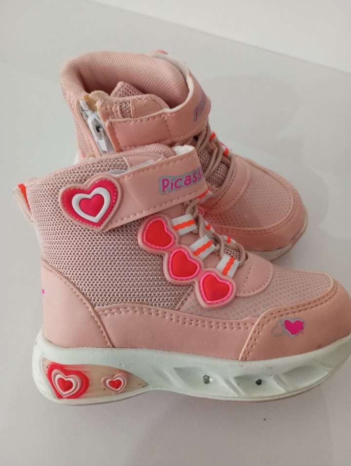 Pembe renkli, kalp desenli ve cırt cırtlı kız çocuk spor ayakkabısı. Kauçuk malzemeden, rahat tasarımlı ve "Picas" yazılı bantlı.
