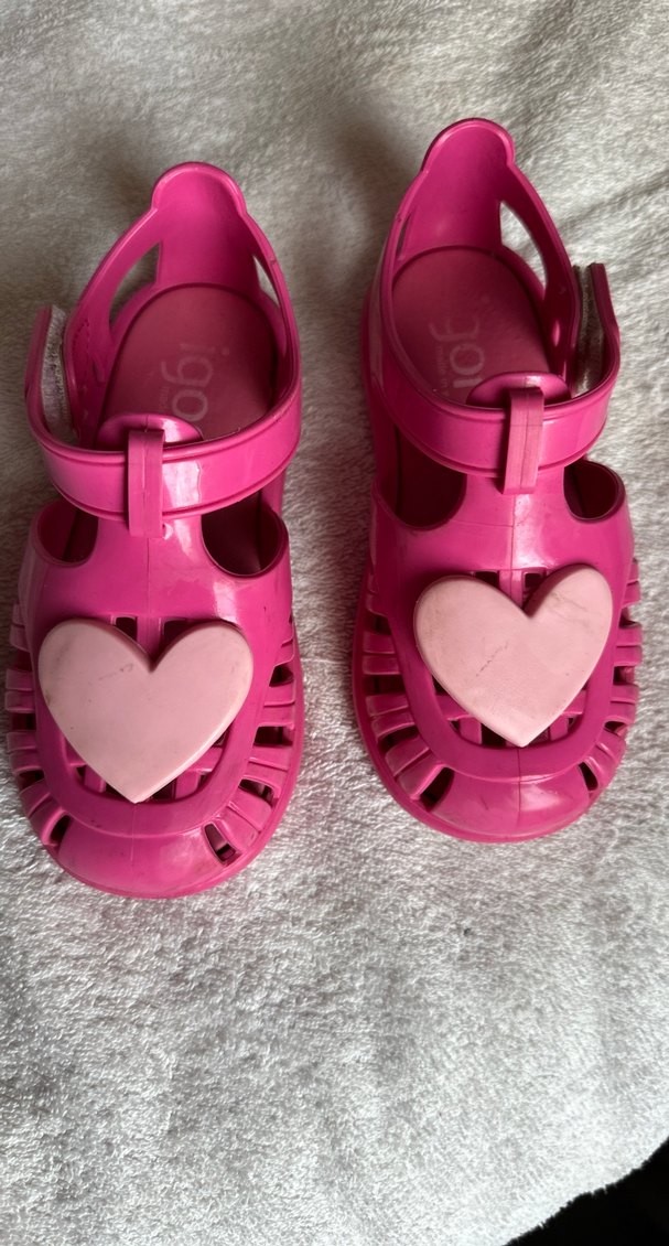 Pembe renkli, kalp detaylı ve bantlı kız çocuk sandaletleri, yumuşak kauçuk malzemeden üretilmiştir. Pastel tonlarda pop kültür esintili tie-dye deseni bulunur.