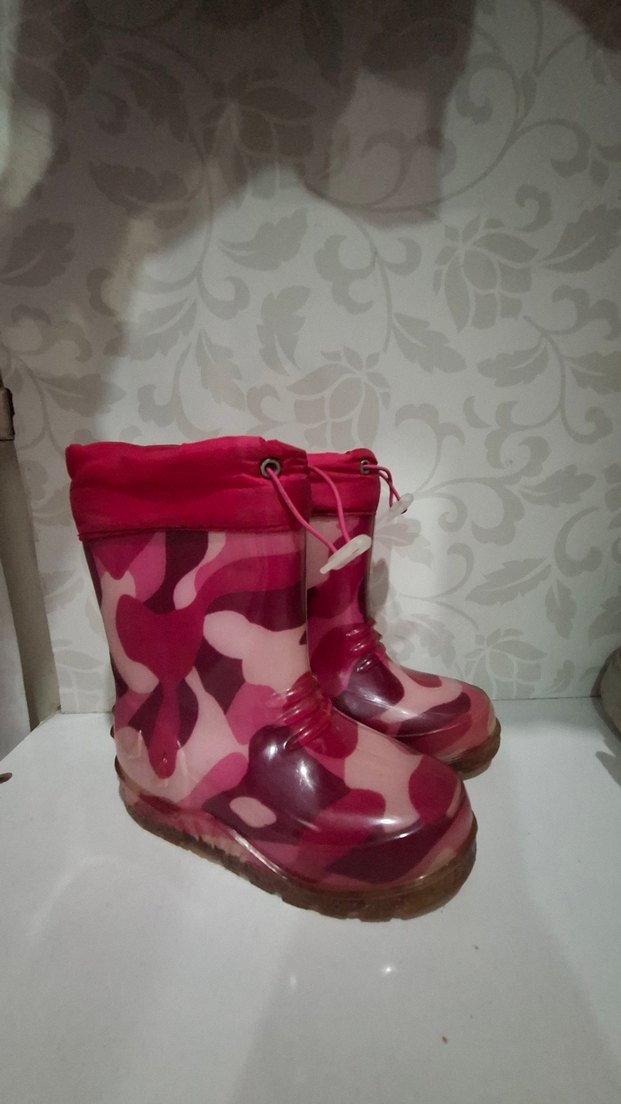 Kız çocukları için pembe kamuflaj desenli lastik çizme, tokalı ve üstte bağcıklıdır.