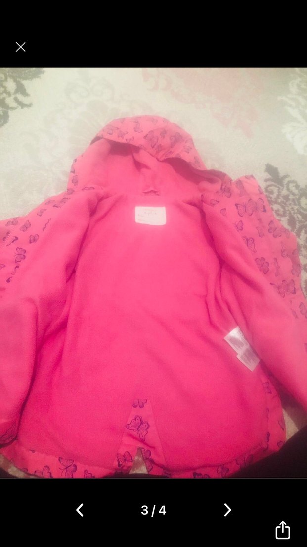 Kız çocukları için kapüşonlu, renkli kelebek baskılı, kürklü detaylı, rahat ve sıcak kumaştan yapılmış dar kesim mont.