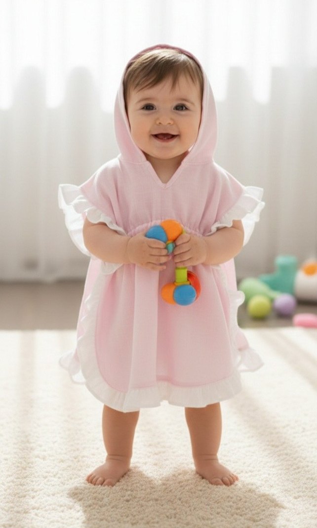Kız çocuklar için yumuşak ve sıcak pembe kapüşonlu bornoz, pastel tonlarda batik desenli ve narin fırfırlı kenarlara sahip. Banyo sonrası rahatlık sağlar.