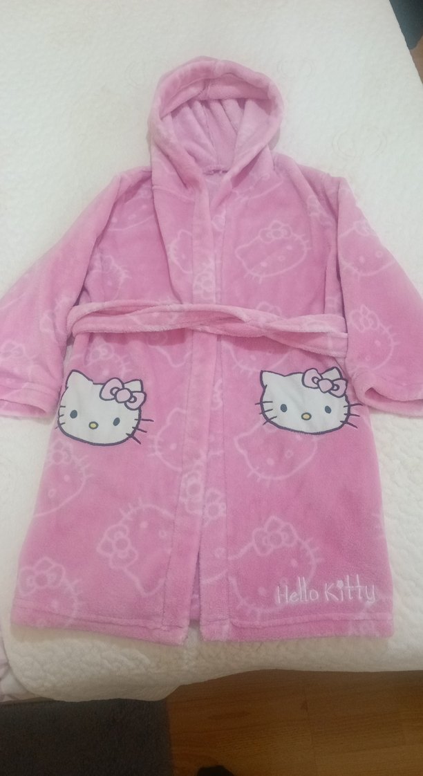 Pembe kapüşonlu kız çocuk bornozu, yumuşak ve sıcak kumaştan, Hello Kitty baskılı ve kemerli. 4-6 yaş arası için uygundur.