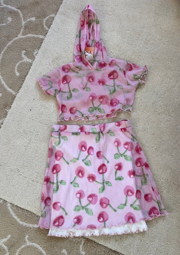 Pastel pembe renkte, kiraz desenli kız çocuk kapüşonlu bornoz ve etek seti. Yumuşak sentetik kumaştan, kısa kollu üst ve uyumlu etekten oluşur. 18-24 ay