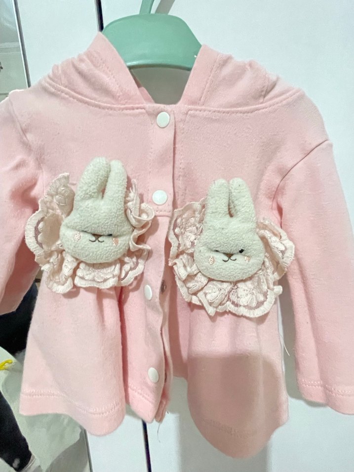 Düğmeli, kapüşonlu, pastel pembe, fitted kesim kız çocuk ceketi. Nakışlı tavşan süslemeleriyle yumuşak ve rahat kumaş.