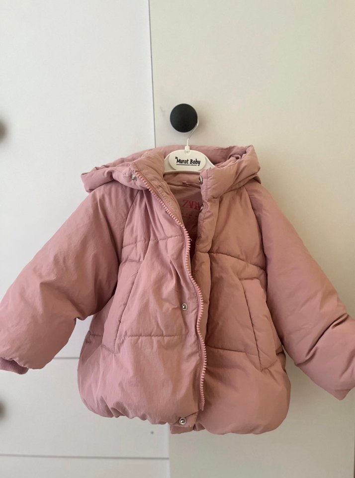 Pastel pembe kız çocuk mont, düğmeli ve kapüşonludur. Notlu yaka ve bol kesimiyle sokak stiline uygundur. Yumuşak ve sıcak kumaştan üretilmiştir.