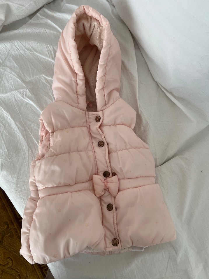 Pembe pastel renkte, düğmeli kapüşonlu kız çocuk yeleği. Kolsuz, fitted kesim ve yumuşak, sıcak kumaştan, sokak stili için uygun. Küçük lekeler var.Fotoğrafta belli