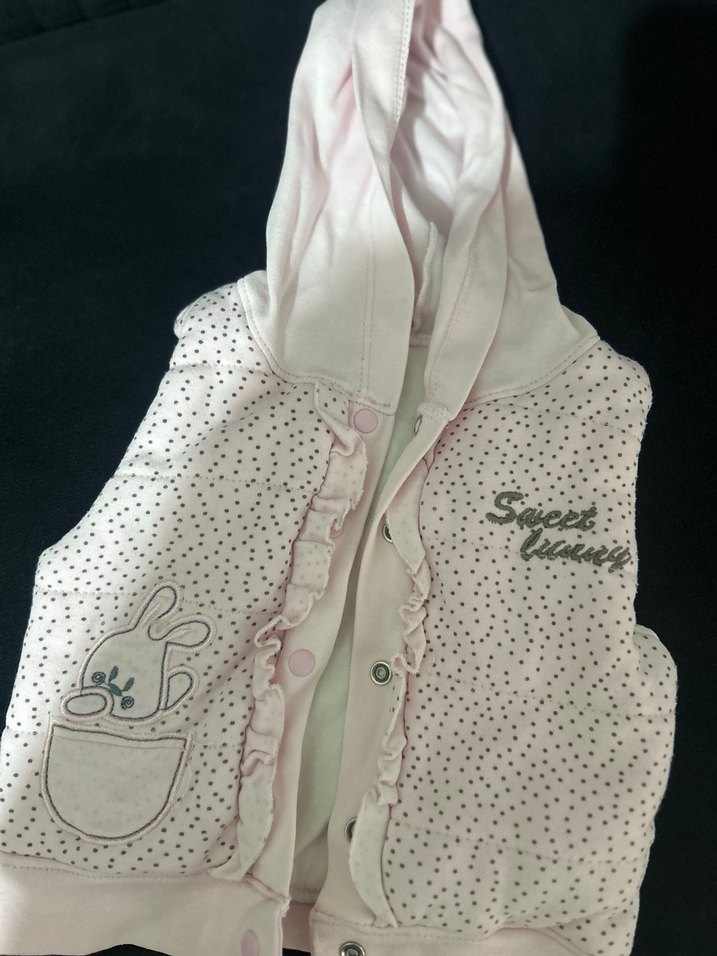 Pembe, kapüşonlu, düğmeli, baskılı desene sahip kolsuz yelek. Yumuşak sentetik kumaştan, trend günlük stil için uyumlu kesimle.