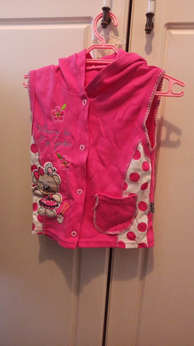 Pembe kapüşonlu, düğmeli kız çocuk yeleği. Ayıcık ve çiçek desenli, renkli baskılı, kolsuz ve dar kesim. Önde küçük cep bulunur.