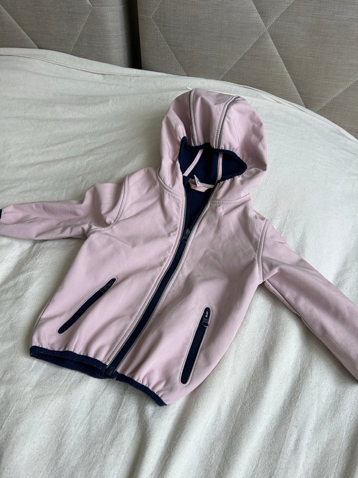 Yumuşak ve sıcak kumaştan, kapüşonlu ve fermuarlı ceplere sahip, pastel pembe renkli kız çocuk için dar kesim ceket. Street wear tarzında. Fermuar kısımlarında hafif soyulma mevcuttur ama çok göze batmıyor