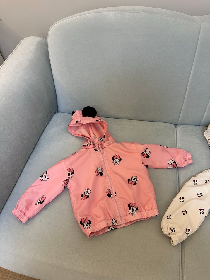 Kız çocukları için pembe kapüşonlu, fermuarlı, renkli baskılı ve yumuşak sıcak kumaştan yapılmış ceket. kızım 2 yaşında çok rahat kullandı. Herhangi bir yerinde yırtık sökük leke yoktur
