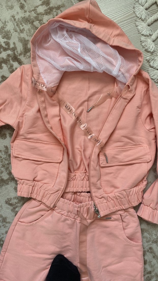 Kız çocukları için kapüşonlu, fermuarlı cepli, bol kesim eşofman. Yumuşak sentetik kumaştan, pastel pembe renkte, uzun kollu ve rahat elastik bel bantlı.