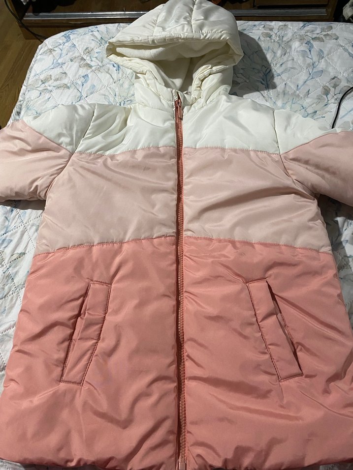 Fermuarlı, kapüşonlu ve notched lapel yaka detaylı, pastel pembe ve krem renk bloklu kız çocuk montu. Yumuşak sentetik kumaştan, trend sokak stili için uygun. Bı kac jez gıyıldı