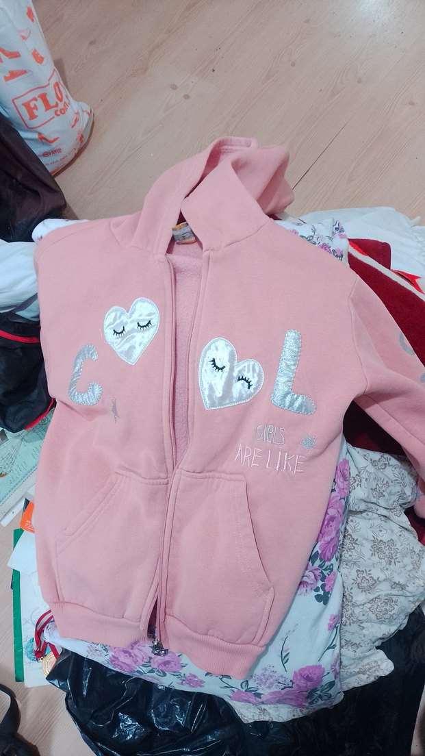 Pembe kapüşonlu kız çocuk sweatshirt, bol kesim ve uzun kolludur. Fermuarlı ve kalp desenli baskılıdır, yumuşak kumaştandır. Trendy sokak stiline uygundur.