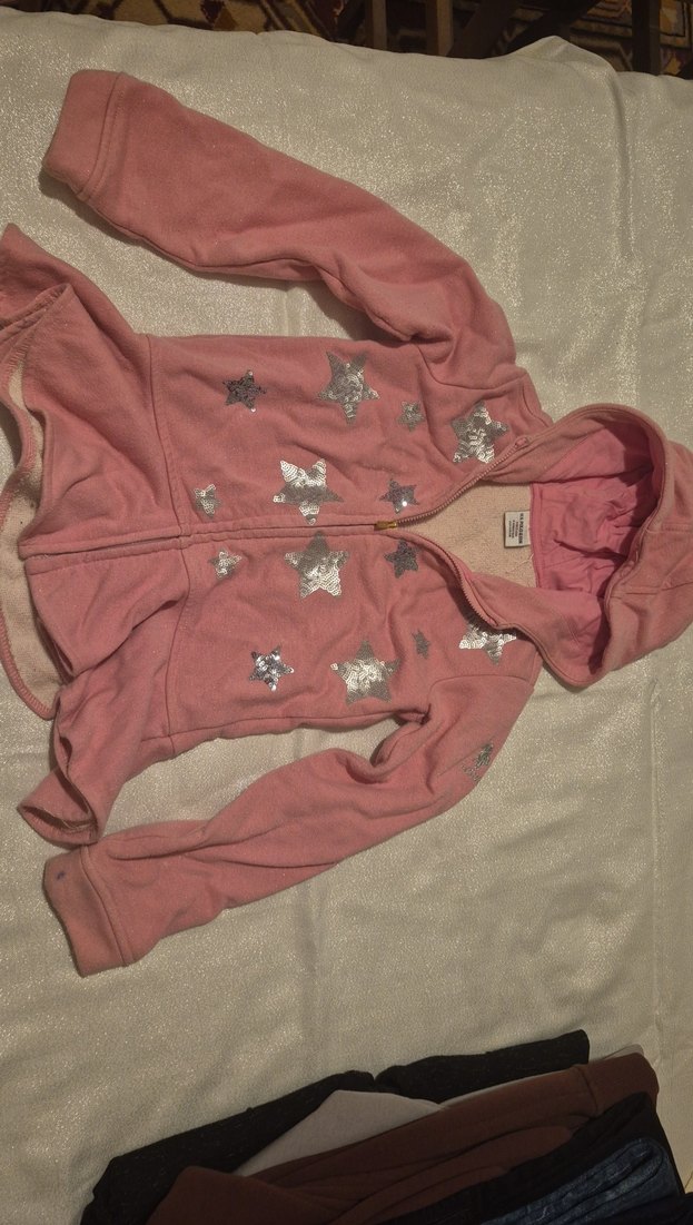 Kız çocukları için pembe kapüşonlu, fermuarlı ve uzun kollu sweatshirt. Yumuşak ve sıcak kumaştan, işlemeli yıldız desenleriyle trendy sokak stili için uygun. ⭐
