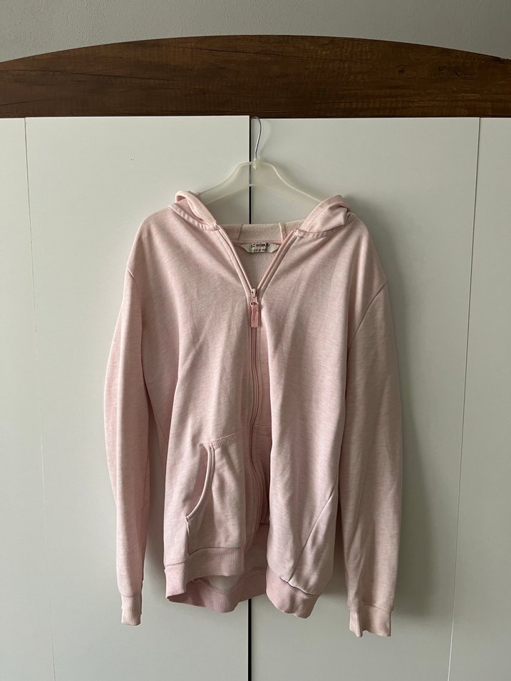 Pastel pembe renkli kız çocuk sweatshirti, kapüşonlu ve fermuarlı. Yumuşak kumaştı, rahat bol kesim ve uzun kollu.