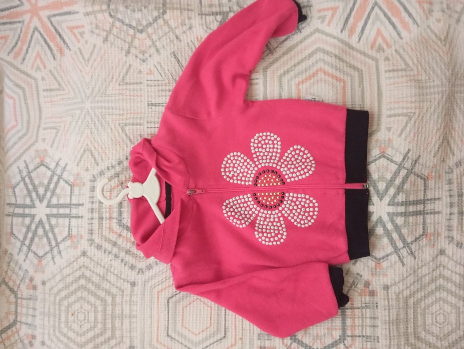 Kız çocukları için kapüşonlu, uzun kollu ve fermuarlı pembe sweatshirt. Yumuşak ve sıcak kumaştan, renkli çiçek baskılı, rahat ve şık. kullanıma bağlı hafif tüylenme mevcut