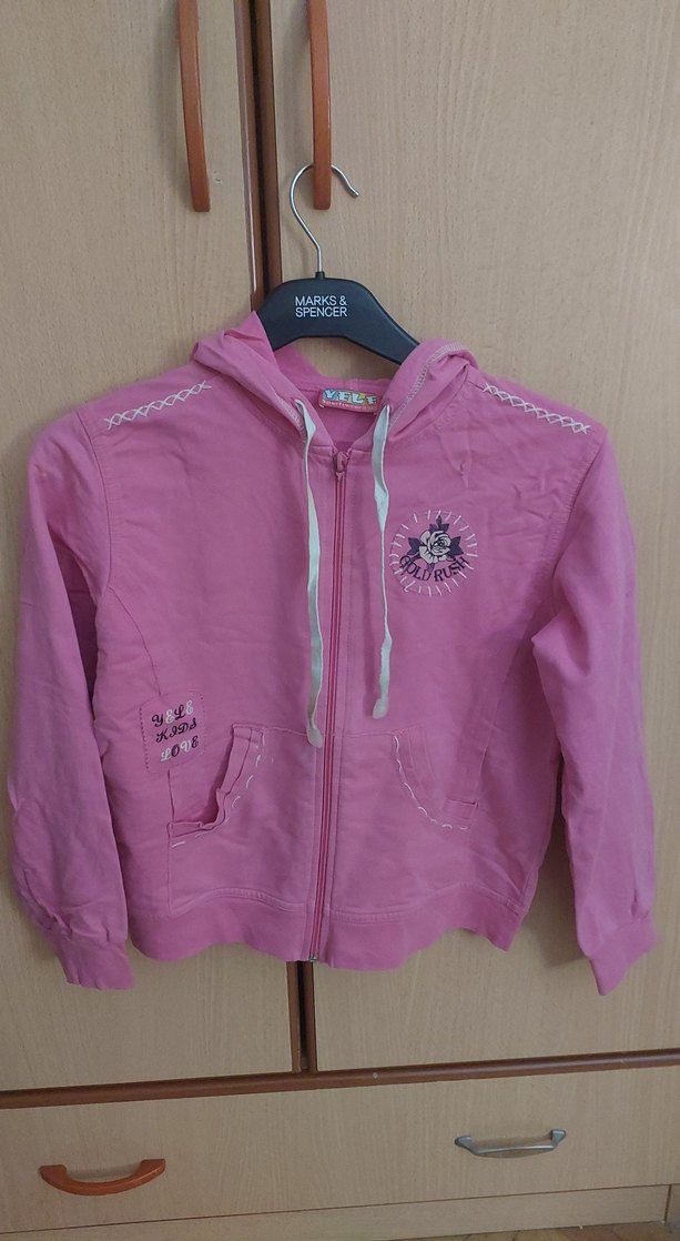 Kız çocuklar için pembe kapüşonlu, fermuarlı, uzun kollu ve nakışlı sweatshirt. Yumuşak ve sıcak kumaştan, rahat bir sokak stili sunar. 11 yaş için.