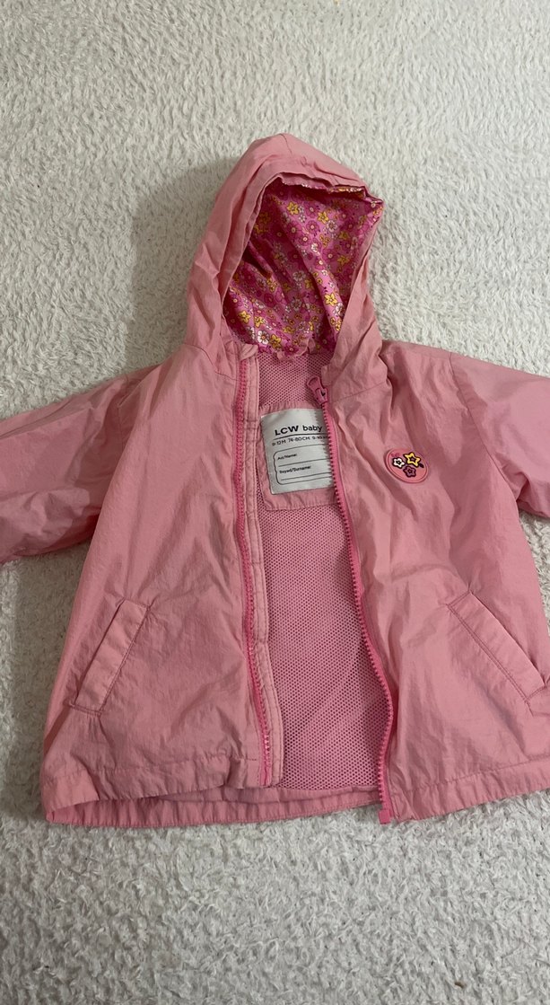Pastel pembe renkli kız çocuk yağmurluğu, fermuarlı ve yakası notched lapel. Yumuşak fleece astar ve kapüşonun iç kısmında çiçek desenli baskı bulunur.