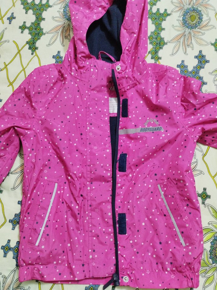 Pembe renkli, kapüşonlu ve fermuarlı kız çocuk yağmurluğu, yumuşak kürk dokulu kumaştan yapılmıştır. Desenli ve notched lapel yakalı, sokak tarzında bir üründür. ️içi polarlı ama ince mevsimlik mont