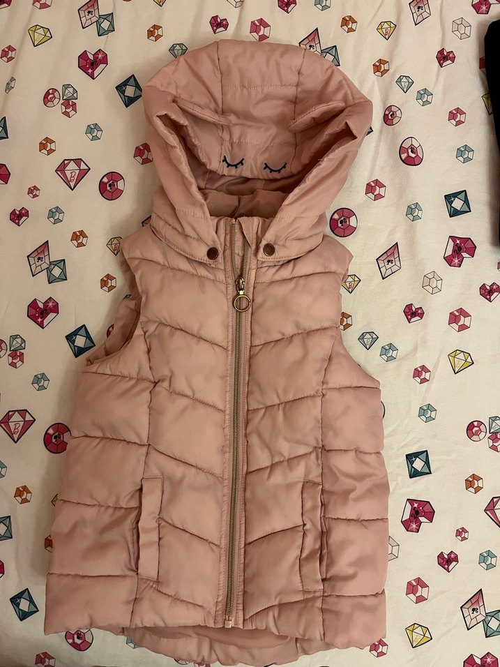 H&M Pembe, kapüşonlu, fermuarlı ve işlemeli detaylara sahip kız çocuk yeleği. Yüksek yakalı, kolsuz 6-8 yaş