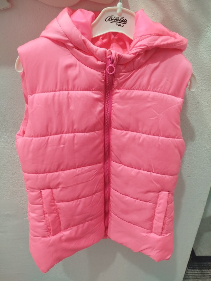 Pembe renkte, kapüşonlu ve fermuarlı kız çocuk yeleği. Yumuşak ve sıcak kumaştan, dar kesim, cepli ve basic tarzda.