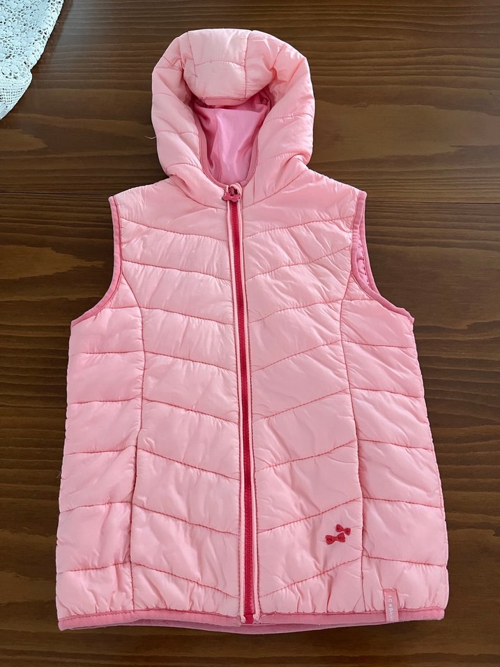 Pembe kapüşonlu, fermuarlı ve kolsuz, yumuşak ve sıcak kumaştan yapılmış kız çocuk yeleği. Trend sokak tarzı için uygun. 9-10 yaş