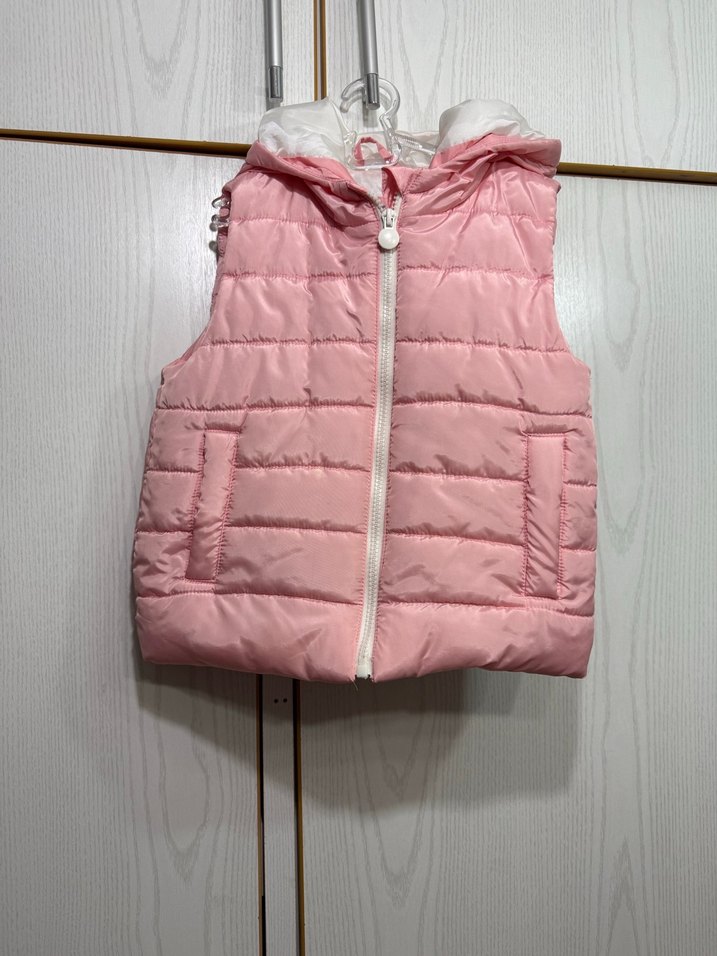 Pembe pastel renkli, fermuarlı ve kapüşonlu kız çocuk yeleği. Kolsuz, straplez kesim ve rahat sokak stili sunar.