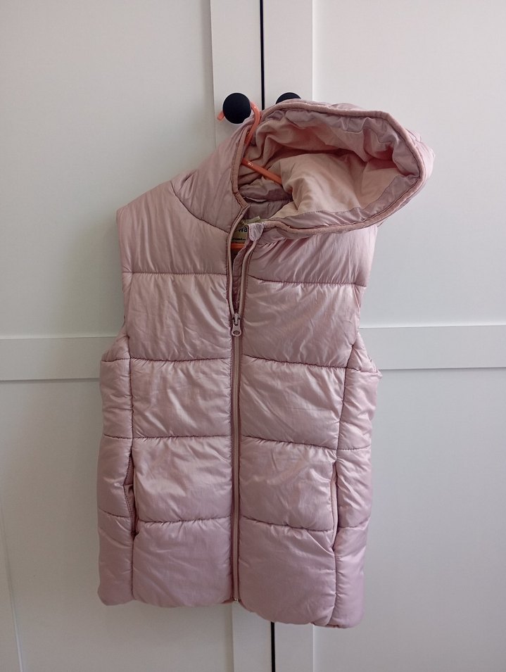 Yüksek yakalı, fermuarlı ve kapüşonlu pembe yelek. Yumuşak ve sıcak kumaştan, trend günlük giyim için uygun dar kesim.
