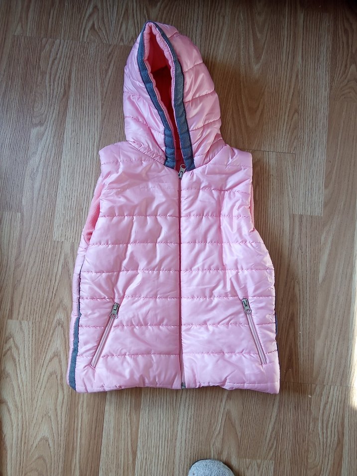Kız çocukları için pembe kapüşonlu, fermuarlı cepli, kolsuz yelek. Yumuşak ve sıcak kumaştan, rahat çok az kullanıldı.
