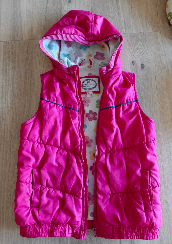Kız çocuklar için kapüşonlu, fermuarlı, pembe renkli, dar kesim yelek. Renkli iç astarıyla sokak modasına uygun.