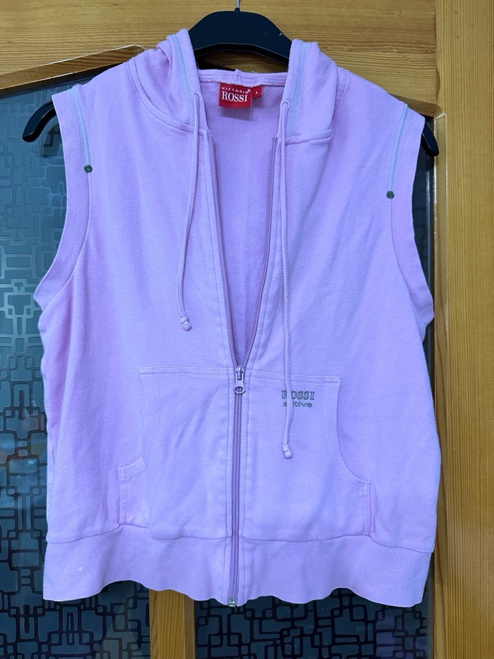 Yumuşak ve sıcak kumaştan, kapüşonlu ve fermuarlı pembe kolsuz yelek. Rahat kesimli ve cepli, günlük kullanıma uygun.