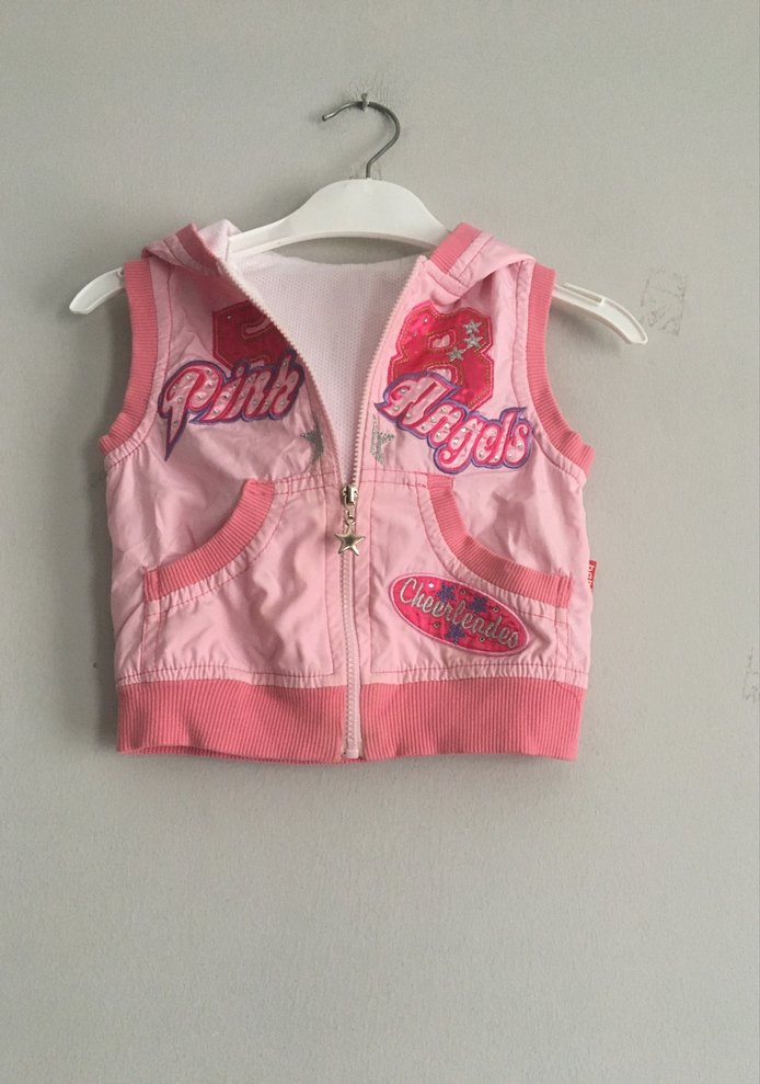 Pembe renkli, fermuarlı ve baskılı kız çocuk yeleği. Sentetik kumaştan, kolsuz ve straplez, vücuda oturan kesimle rahat ve şık.