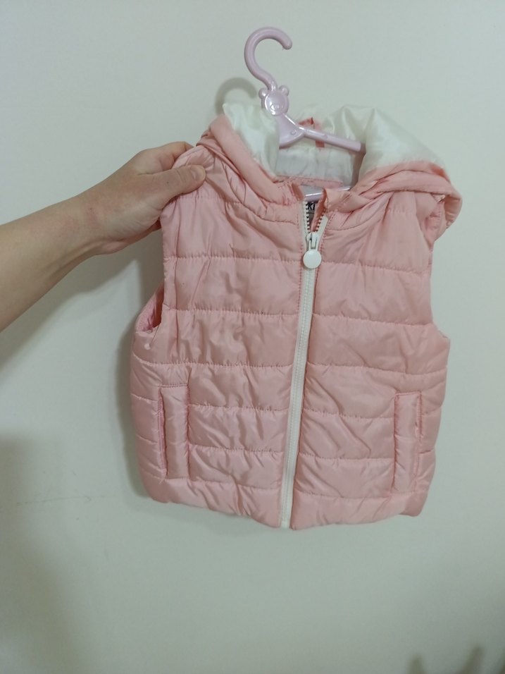 Kız çocukları için pastel pembe renkte, kapüşonlu ve fermuarlı, kolsuz, düz kesim yelek. Yumuşak ve sıcak kumaştan üretilmiştir, rahat bir sokak stili sunar.
