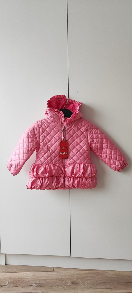 Kapüşonlu, pembe renkli, yumuşak ve sıcak kumaştan yapılmış kız çocuk montu. Fırfır detayları ve nakışlı desenleri bulunur.