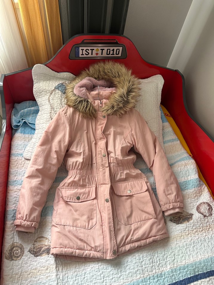 Pembe kapüşonlu, kürklü detaylı kız çocuk kabanı, yumuşak ve sıcak kumaştan, rahat sokak tarzına uygun.