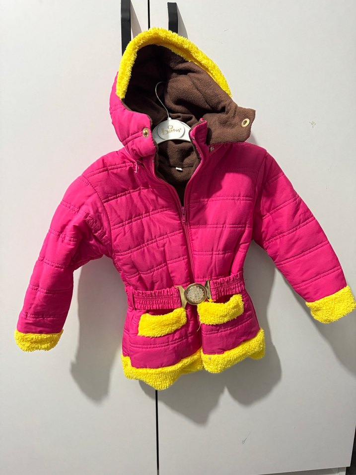 Kapüşonlu, kürklü detaylı, pembe ve sarı renkli, bele oturan kız çocuk montu, yumuşak ve sıcak kumaştan üretilmiştir.