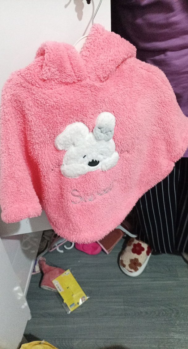 Renkli pembe kapüşonlu, uzun kollu, yumuşak ve sıcak kumaştan yapılmış, kürklü nakış detaylı kız çocuk pançosu. Rahat kesim, günlük sokak stili için uygundur.