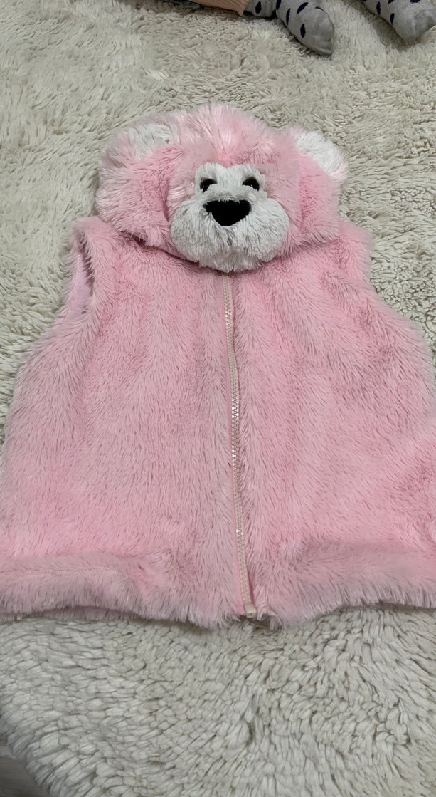 Yumuşak ve sıcak kumaştan yapılmış, kapüşonunda sevimli ayı yüzü detaylı, kız çocukları için pembe, kürklü ve işlemeli yelek. Kolsuz ve dar kesimdir.