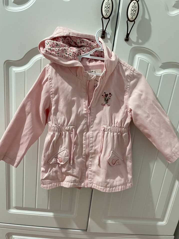Pembe, kapüşonlu, nakışlı ve düğmeli cepleri olan kız çocuk ceketi. İç kısmı yumuşak kumaşla kaplı, fermuarlı ve rahat kesimlidir.
