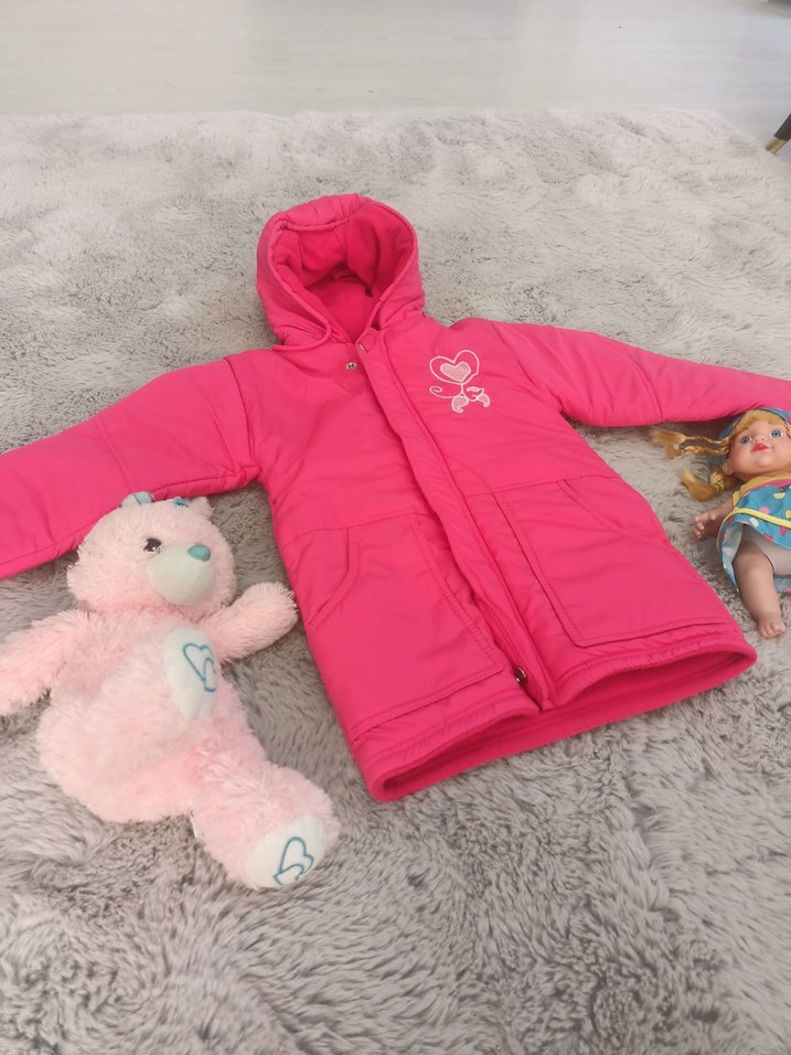 Kız çocukları için kapüşonlu, nakış detaylı ve kürklü pembe mont. Yumuşak astarlı, renkli ama sade sokak stili görünüm sunar.