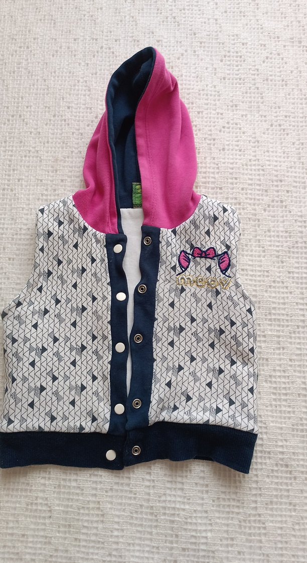 Pembe kapüşonlu, gri desenli, nakışlı ve düğmeli kız çocuk yeleği. Kolsuz ve vücuda oturan kesimle sokak tarzı için uygun. çift yönlü kullanılıyor beyaz tarafın yakasında hafif sarı leke var çıkar belki ben uğraşmadım ve çok kalın kışın sıcak tutar