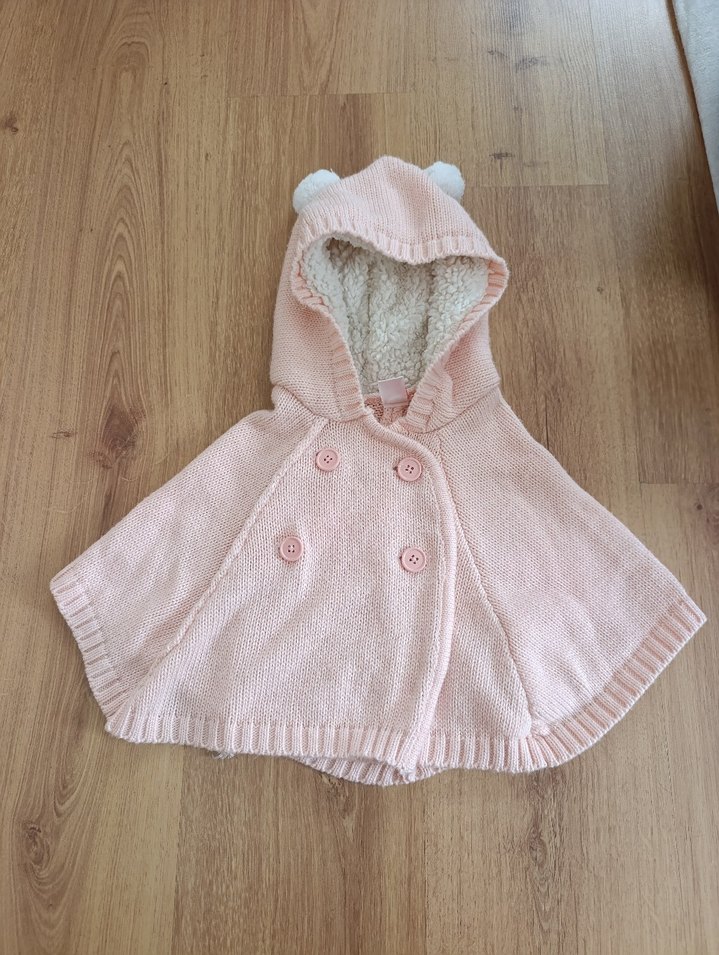 Pembe renkli, kapüşonlu ve örgü kız çocuk pançosu. Yumuşak astarlı, uzun kollu, düğmeli, bol kesim ve rahat bir yapıya sahiptir. 1 kere giyildi sorunsuz koton marka