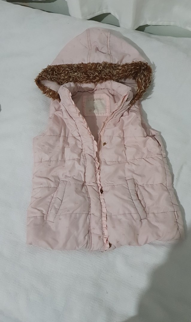 Pembe renkli, kapüşonlu ve peluş detaylı kız çocuk yeleği. Kolsuz ve straplez yakalı, sıcak ve yumuşak kumaştan yapılmıştır.